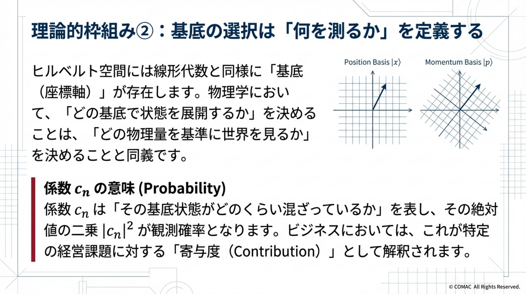 個々のマネージャーのインタビューやビジョンを「状態ベクトル」として扱い、組織全体を⼀つの巨⼤な「ヒルベルト空間(ベクトル空間)」として定義します。