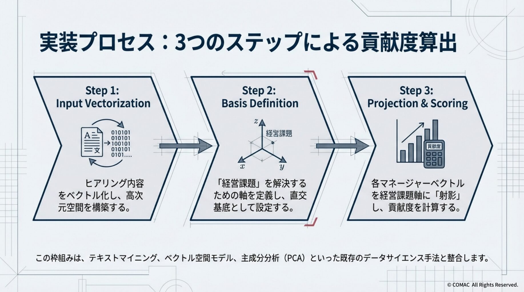 形成された空間内で経営課題軸に対するマネージャーベクトルの「射影(Projection)」を計算し、誰がどの課題解決に最も適しているかを客観的な数値として算出します。